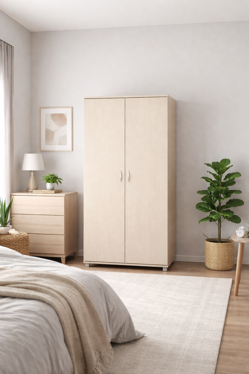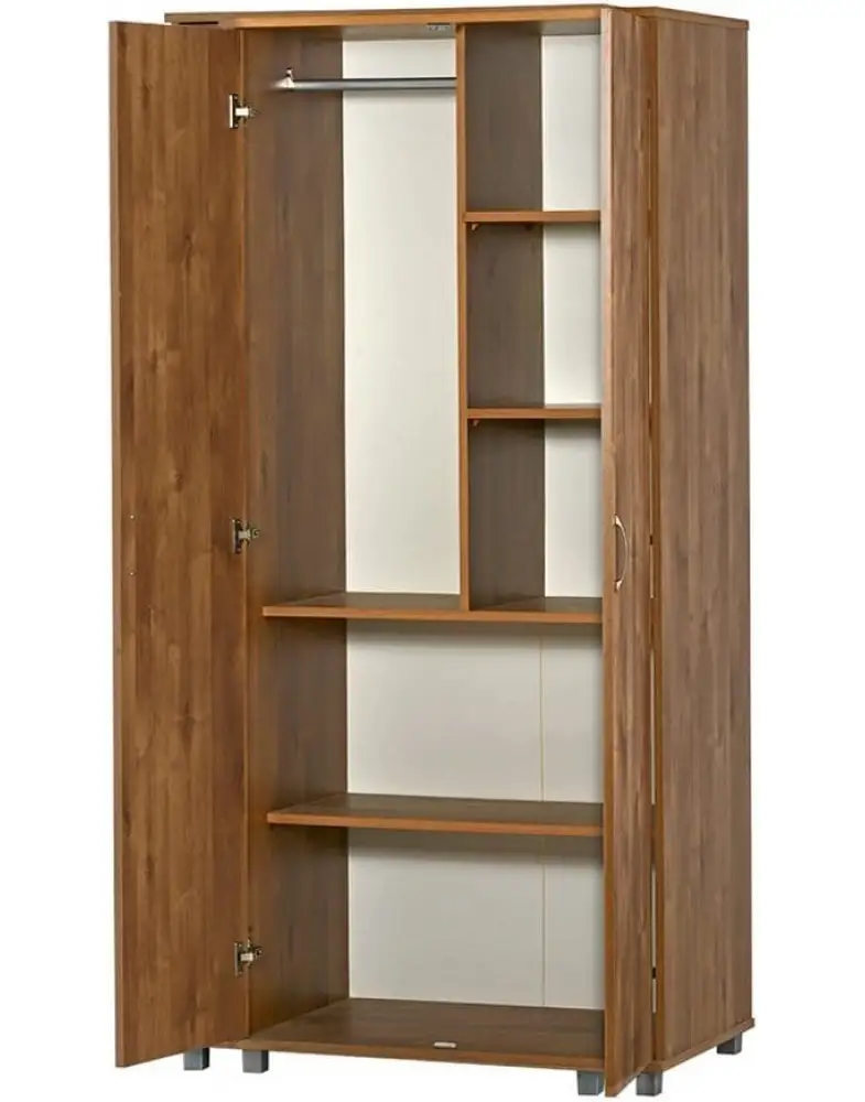 הארון כולל שתי דלתות מלאות עם ידיות מתכת בעיצוב עדין ונוח לשימוש יומיומי. המבנה הגבוה מאפשר ניצול יעיל של שטח האחסון לגובה, תוך שמירה על מראה קליל ולא עמוס. החלוקה הפנימית מאפשרת אחסון מסודר של בגדים, כלי בית, ציוד משרדי, מצעים, קופסאות ופריטים שימושיים נוספים.