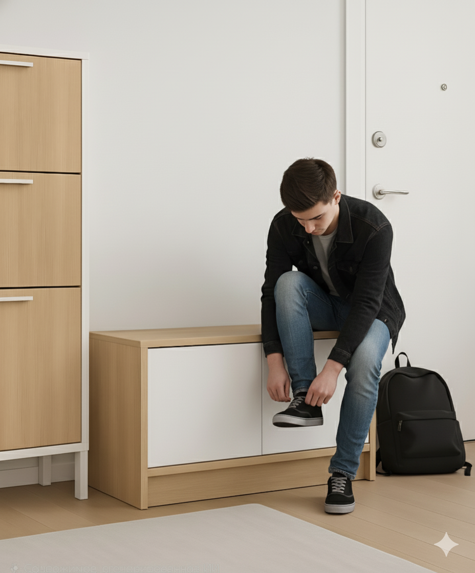 ארון נעליים דגם 174 – הרהיט משלב בין ארון נעליים מרווח לבין ספסל ישיבה נוח, המאפשר לנעול נעליים בנוחות מבלי להתכופף. עיצוב נקי וקלאסי המתאים לכל סגנון עיצוב, עם מקום אחסון חכם השומר על הסדר והאסתטיקה. אידאלי לחללי כניסה, מסדורונות וחדרי שינה
